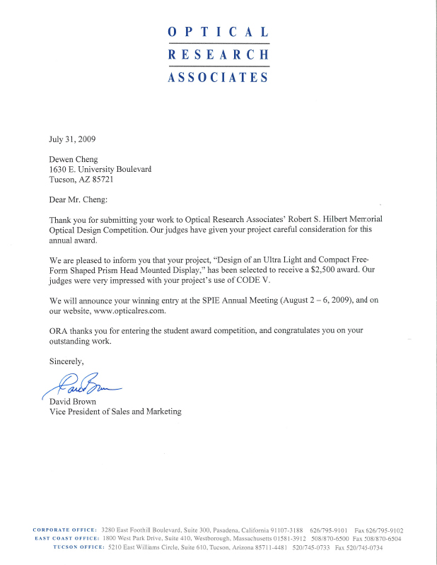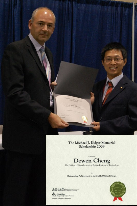 日前,王涌天教授指导的博士研究生程德文在国际上获得两项大奖,一是国际工程光学学会(SPIE)颁发的Michael J. Kidger Memorial Scholarship证书,一是美国Optical Research Associates公司颁发的annual optical design Top Award。