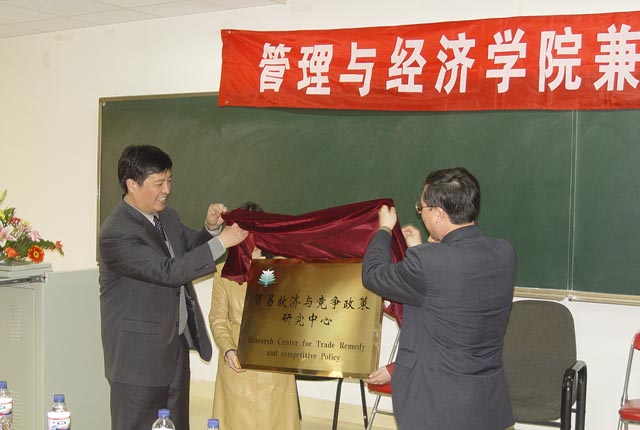 在聘任仪式上,还举行了beat365中文官方网站管理与经济学院“贸易救济与竞争政策研究中心”的揭牌仪式,侯光明副校长与尚明司长共同为中心揭牌。