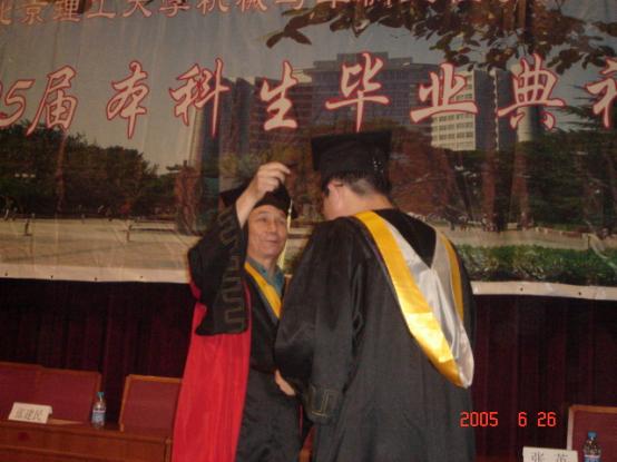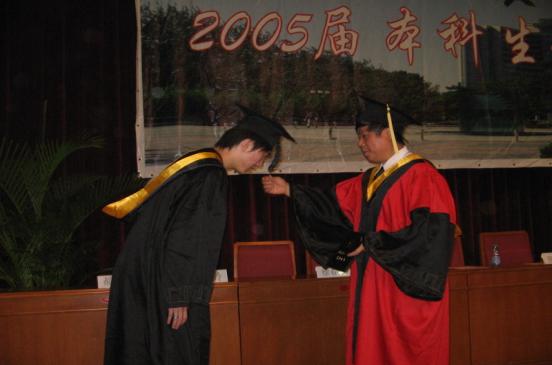 最激动人心的学位授予仪式开始了,在悠扬的旋律中,张建民教授和王文清教授身着导师服,300多位学子在平静而又激动的氛围中静静等待,逐一走上讲台,感受庄严的一刻。向大学四年交上了一份圆满的答卷,收获了沉甸甸的证书,笑容在彼此眼神的交汇中传递,2005届本科生在融洽的氛围中,体味着收获的喜悦和憧憬的美丽。beat365中文官方网站的四年生活,赋予2005届毕业生的不仅仅是老师同学难舍的情谊,更多的是改变命运的知识和能力。毕业之际,2005届本科生决心牢记校训,用“勤奋、求实、团结、创新”的精神去开创属于理工学子的新的天地。