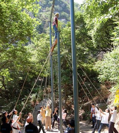 “过电网”是拓展训练的经典项目:全体队员在规定时间内,身体不接触电网的情况下,顺利穿过电网。需要调动大家运筹帷幄的思维,统筹队员过电网的顺序和选择合适的电网口。一个看似简单的活动,其中队员却可以感受到协作、支持的力量。每人伸出一直手,久可以撑起一片蓝天。