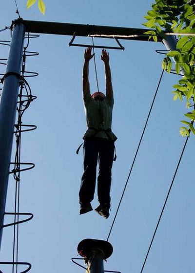 “空中行走”让每个队员体会了战胜心理恐惧的超越体验,特别是平时有些恐高的队员,当在飞跃断桥的一霎那,那股勇气和毅力博得大家一致的掌声,鼓励和赞扬声随着高空的一跃而飞扬;
