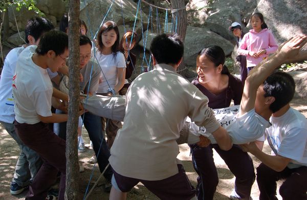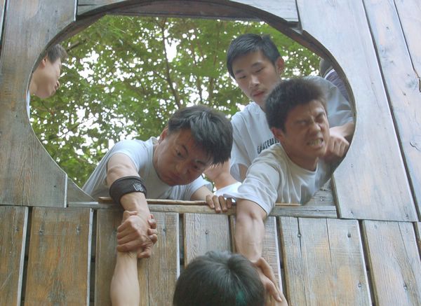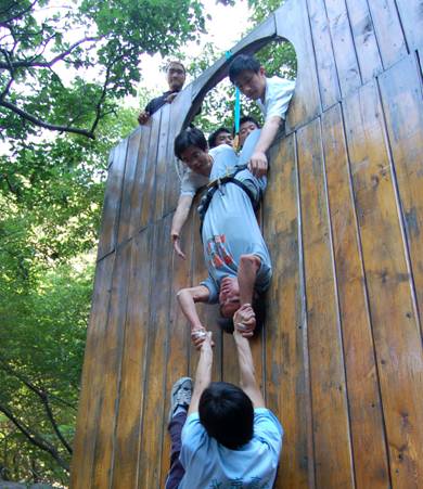 基地培训师将参训70人分为五队,各队分别起队名、选队长、画队旗、唱队歌,并进行展示。“飞鹰队”、“火箭队”、“久尊队”“黄蜂一号”和“神七队”,这些带有理工特色的团队应运而生,各队嘹亮的队歌回荡在幽静的山谷。9:00正式开始一天的拓展训练项目。