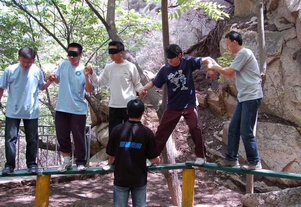 在经历了激烈的体能和智能项目考验后,“孤岛求援”让队员感受沟通的重要性,构建交流的渠道:队员被分别带到不同的岛屿,成为盲人、哑人和健全人,每个岛上的人分别有不同的任务书,如果每个队只局限于完成自己小任务,忽略各岛之间的合作,那共同救援盲人的总目标则无法实现。