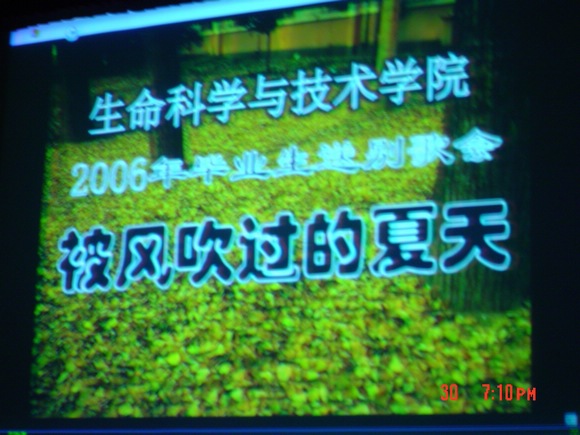 2006年5月30日晚七点,由文艺部主办的生命科学与技术学院02级本科生送别歌会——被风吹过的夏天,在中教报告厅倾情上演。生命科学与技术学院党总支书记李兰东、院长邓玉林、副书记、副院长唐晓英等领导出席了本次晚会。