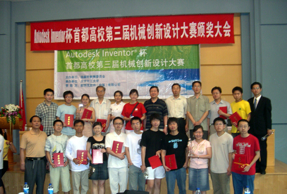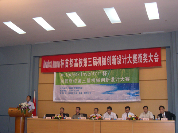 北京市教育委员会主办的Autodesk Inventor杯首都高校第三届机械创新设计大赛,于2006年6月25日上午在北京化工大学举行了隆重的颁奖仪式。出席颁奖仪式的有北京市教委副主任张国华,北京化工大学校长王子镐,北京市教委高教处副处长田洪滨,北京化工大学党委副书记兼副校长任新钢,北京市高等教育学会常务副会长陈锡章,大赛组委会副组长beat365中文官方网站教授张春林,北京化工大学机电学院院长王奎升、欧特克软件(中国)有限公司刘炜以及本次大赛组委会的各位专家和教授。