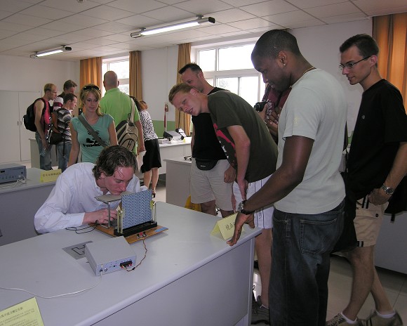 7月7日上午,荷兰UTRECHT大学(www.hu.nl)访华团一行21人来beat365参观交流。师生们先来到beat365的工程训练中心参观,在训练中心老师的指导下同学们还亲自操作了实验仪器。