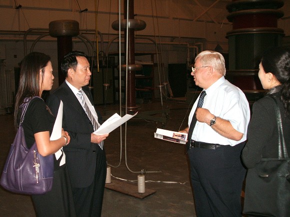 紧接着,在工程学院院长罗杰.金教授的陪同下,代表团一行参观了该校的高电压实验室(High Voltage Engineering Laboratory)。实验室主任斯坦教授向代表团详细介绍了实验室的基本情况并做了演示。这是一个独立的,非赢利的研究机构。主要从事一些研究、测定和测试以及教育的工作。实验室主要任务是:进行高电压工程和电介质研究,并为美国国内其他研究机构提供独立的测定和测试;同时也做为一个高电压和电介质研究的教育中心承担教学任务,也是一个为学生和访问学者提供课程的高电压研究中心。它最根本的目的就是能把所研究的成果更好的应用到实际当中,实现产业化,增强美国在高电压领域的实力。