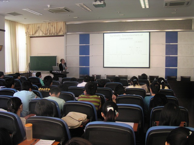 John T. Landrum教授首先向师生们介绍了佛罗里达国际大学(Florida International University,FIU)的整体情况,以及在科研教学等方面的特点和优势,其中他特别介绍了“FIU”招收留学生的相关政策,并表示作为美国东南部一所著名的研究型大学,“FIU”的上百个专业都热情地欢迎广大的中国学生前往深造。随后,John T. Landrum教授从自己的专业研究出发,为beat365师生们作了主题为“眼睛中的胡萝卜素”的讲座。本次交流活动及讲座由生命学院院长邓玉林教授主持。