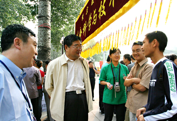 校党委书记焦文俊来到迎新站与新入学的新生亲切交谈。
