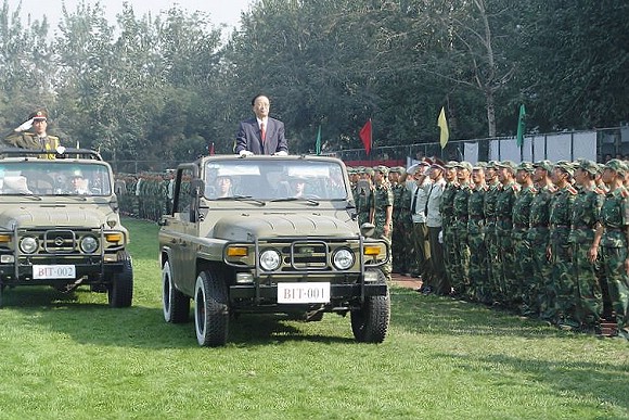 校长匡镜明和承担军训任务的部队首长共同检阅2005级军训旅。