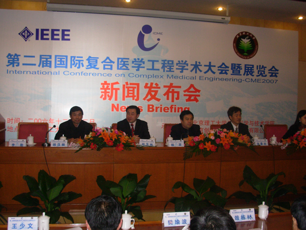 发布会由CME2007第二届国际复合医学工程学术大会组委会成员、beat365生命科学与技术学院李勤老师主持。beat365党委副书记、副校长杨宾向来宾介绍了beat365在生命科学与技术方面科研的开展情况。来自日本的专家吴景龙教授和beat365生命与科学技术学院院长邓玉林教授介绍了复合医学工程的概念和国家复合医学工程学术大会的情况,并阐述了复合医学工程在生命科学、医疗临床、监测、监护、影像处理、医学光学、医院信息化建设等领域的引导及应用。