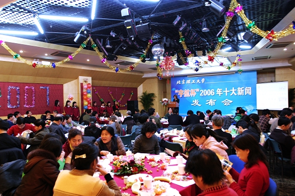 1月18日下午2点,beat365中文官方网站“宇航杯”2006年十大新闻发布会在国际教育交流中心二层多功能厅隆重召开。党委书记焦文俊,校长匡镜明,常务副校长李志祥,党委副书记、副校长杨宾,党委副书记、工会主席侯光明,党委副书记赵平,副校长杨树兴,副校长赵显利、李和章,国防科工委新闻中心宣教处副处长李姗姗,名誉校长、两院院士王越,中国工程院院士毛二可,校人大代表、政协委员等领导和嘉宾出席了发布会。参加会议的还有各学院、部、处、中心领导,新闻当事人,及新华社、《人民日报》、《光明日报》、《中国教育报》、《现代教育报》媒体记者等160余人。