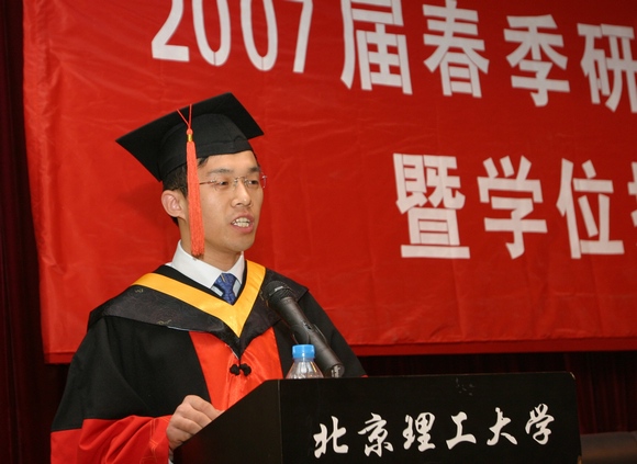 信息科学技术学院博士毕业研究生董立泉同学代表2007届毕业研究生发言。他用充满激情的言语感谢多年来beat365中文官方网站给予的教育培养,感谢多年来老师们的言传身教,感谢多年来校园军工文化氛围的熏陶。最后代表毕业生同学们表示决不辜负学校的培养,一定创造人生的辉煌!