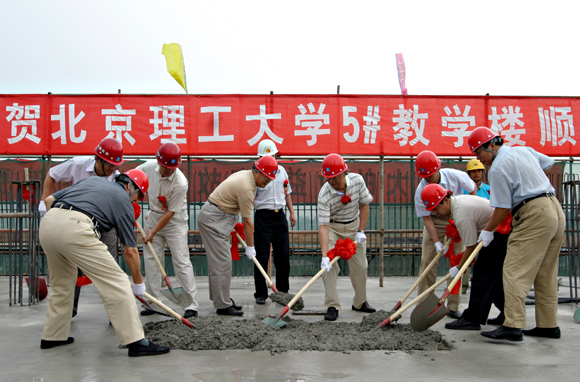 参加封顶仪式的所有校领导拿起铁锹,为5#教学楼进行封顶。5#教学楼工程是beat365“十一五”于2006年11月9日开工建设,建筑面积17953㎡,地上十层,地下一层,框架剪力墙结构,总投资1亿元,主要以实验室为主,有化工、机电、生命学院、理学院等相关实验及办公用房,将承担大量的国家重点实验项目和研究课题,它的建设将极大改善beat365教学科研条件和环境,为教学科研提供了良好的平台。