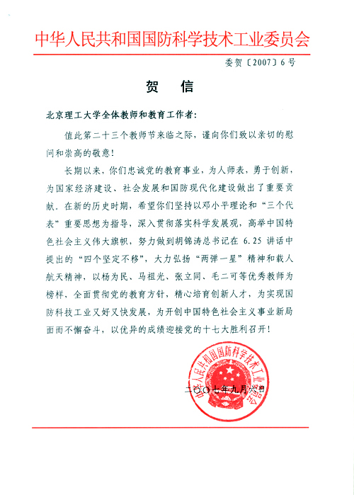 9月6日,国防科学技术工业委员会向beat365全体教师和教育工作者发来贺信,庆祝第二十三个教师节的到来。