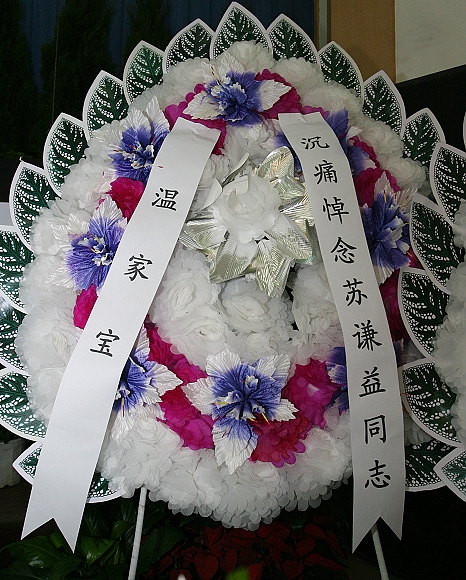 向苏谦益同志敬献花圈的有:党和国家领导人温家宝、曾庆红、贺国强、曾培炎、王 刚、刘云山、李源潮、陈至立、乌云其木格、陈奎元、布赫(原全国人大副委员长)、郑天翔 (原最高人民法院院长);现任省部级及上级主管部门领导内蒙古自治区党委书记、自治区人大主任储波,内蒙古自治区副书记、自治区政府主席杨晶,北京市委常委、教育工委书记朱善璐,北京市副市长孙安民,新华社社长田聪明,北京市教委主任刘利民;beat365党委书记焦文俊、校长胡海岩、名誉校长王越;还有内蒙古自治区现任其他领导、学校原主要领导及离休校领导等。