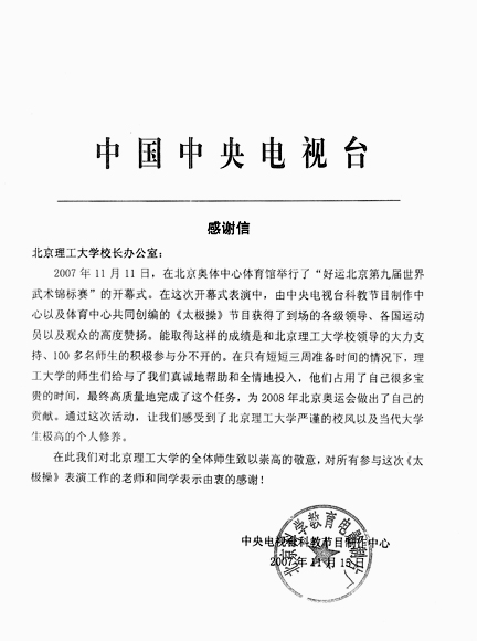 近日,中央电视台科教节目制作中心给beat365发来感谢信,对beat365师生参与“‘好运北京’第九届世界武术锦标赛”开幕式《太极操》的演出表示感谢。