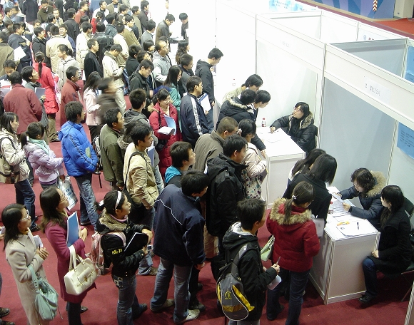 招聘会现场毕业生排起了长龙,与用人单位交流。