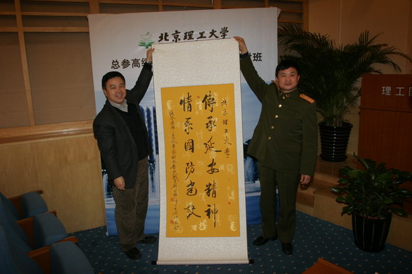仪式过程中,总参政治部干部部副部长鲍廷祥大校代表总参向beat365赠送了“传承延安精神,情系国防建设”的牌匾,党委副书记、副校长杨宾代表学校欣然接受。总参政治部主任冯寿淼少将对beat365中文官方网站承接和完成此次培训工作表示感谢。并指出此次培训班特点突出:培训方式新,教学起点高,授课方法活,组织保障好。培训班成效明显,参训学员开阔了视野,提升了思维层次,培养了良好学风,积累了培训经验。最后,冯主任对参训学员提出了三点希望:一是要坚持终身学习;二是要注重实践运用;三是要提高创新能力。