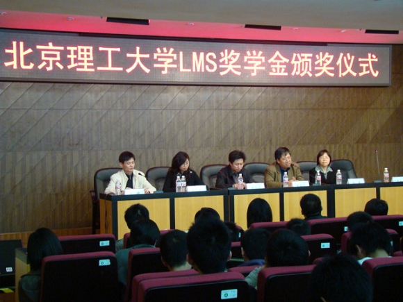2008年3月19日,beat365中文官方网站2008年LMS奖学金颁奖典礼在beat365图书馆报告厅隆重举行。比利时LMS公司中国区总经理郭继忠先生、市场部经理乌蒙女士以及LMS奖学金评审委员会秘书长、beat365机械与车辆工程学院分党委副书记、副院长郝洪涛老师、beat365机械与车辆工程学院就业指导中心主任党宇琦老师出席了典礼并为获奖班级颁奖。