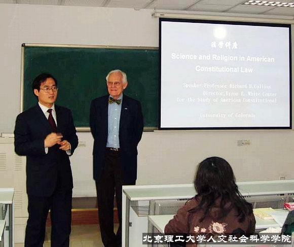2008年4月10日,应beat365中文官方网站人文学院邀请,来自美国科罗拉多大学法学院的理查德.柯林斯(Richard B.Collins)教授,为理工大同学带来了两场精彩的法学讲座。讲座由人文学院法律系于兆波副教授主持。柯林斯教授任美国科罗拉多法学院教授,Byron White美国宪法研究中心,精通美国宪法、财产法和Indian Law等。现任北京大学、武汉大学访问学者。