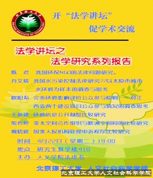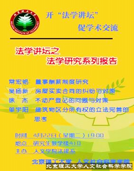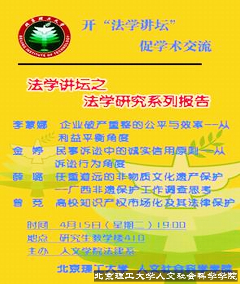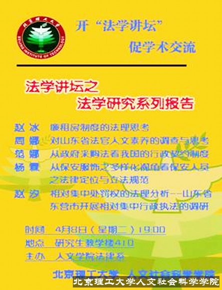 2008年4月8日—4月29日期间,人文学院法律系成功举办了第四届法学讲坛之法学系列研究报告活动。来自人文学院法律系07级法学专业的19名研究生先后进行了报告。系列报告包括法学理论、民商法学、国际法学与环境法学四个学科,专业领域涉及比较法学、立法学、司法制度学、公司法、商法、知识产权法、空间法学、国际人权法、环境法律制度、环境保护法等多个研究方向。这是本活动自2004年开始举办以来,第一次由来自四个二级学科专业的研究生共同作报告,大家在社会调查的基础上,从各自的专业领域出发,对于法律问题进行研究,体现了法律系研究生学术研究多元性、交叉性、前沿性、实践性的新特点。