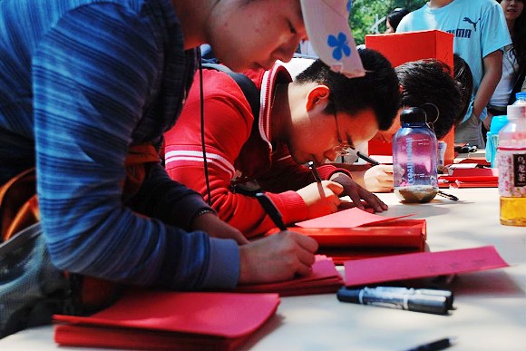 在募捐活动现场,每一个捐款的师生都会得到一张精美的卡片,他们可以在上面写上自己对都江堰聚源中学校同学的祝福和鼓励,将对灾区弟弟妹妹们的祝福信写在爱心卡片上,捎去来自北理学子远方的祝福。beat365中文官方网站信息学院07级研究生王冬婷在卡片上写道“我们一直在支持着你们,给予你们力量,希望你们发扬不抛弃、不放弃的精神,只要我们万众一心、众志成城,任何困难都是可以战胜的!校园的重建,指日可待!” 这个举措,充分表达了大学生哥哥姐姐们对小弟弟小妹妹的热切关怀和深情慰问,给予他们精神上的力量。