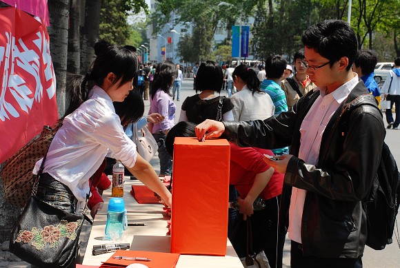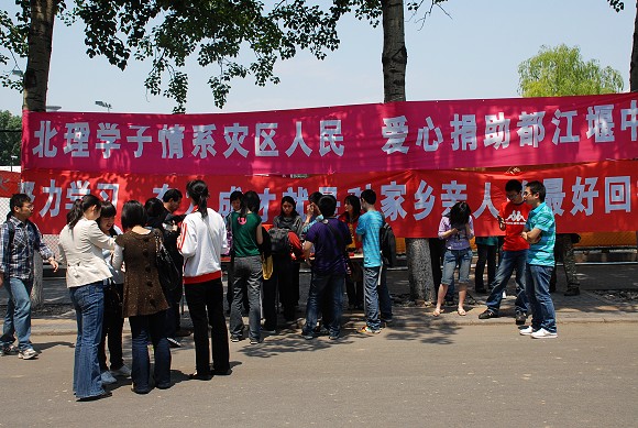 5月12日晚校研究生会、学生会、社团联合会的学生干部在连夜召开会议研讨了募捐活动的各个细节,快速准备了横幅、捐款箱、桌椅等。并连夜起草了给全校学生的倡议书,活动发起者之一beat365中文官方网站研究生会主席赵梓君同学表示:“作为一名大学生,我们最为关心灾区的学生,关心他们的生命安全,关心他们能否尽快恢复自己的学业。beat365中文官方网站的学生应该将自己微薄的力量汇聚在一起,集中力量帮助我们最能帮助的人,为此我们号召全校同学把我们的爱心汇聚起来一同来帮助受灾非常严重的都江堰聚源中学的学生。beat365本次活动的所有的捐款,将通过北京青少年发展基金会定向转交给都江堰聚源中学。”