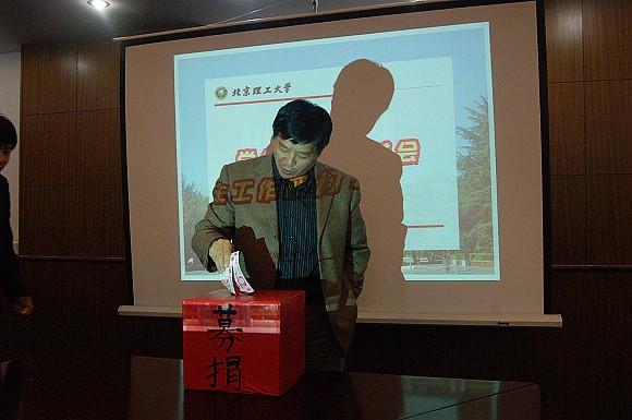 在学校“学生工作研讨会”现场,党委副书记侯光明对全校的抗灾救灾工作进行了统一部署,提出了明确的要求,他带领近30名学生工作干部以及教务处、学管中心领导进行了捐款。