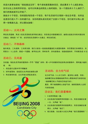 活动现场还时不时传来阵阵欢呼加油声,那是同学们在参加心理游戏。为了配合本次心理健康节的主题,特别设计了“挑战奥运五环”这一环节。活动要求5人组队参加,因为每个游戏都是集体项目。大河之舞、不倒森林、无间道、合力吹气球、我们是最棒的,只要能完成这五个项目,5个小组成员就可以每人获得一份精美奖品。5个游戏代表奥运五环,五环有各自的个性,五环是合作的象征。同学们在游戏中体验五环里的奥运精神,领悟心理游戏中的健康人生!