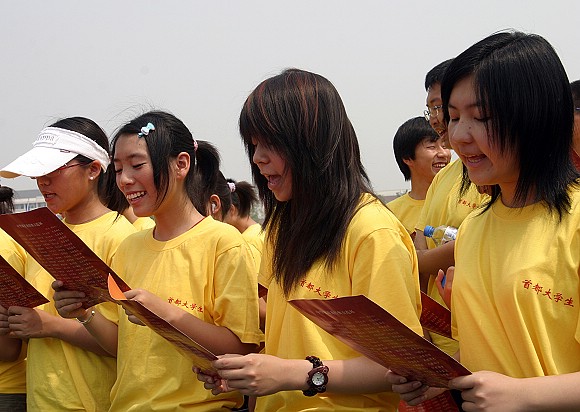 最后,4000余名大学生围绕校园进行了长跑。数十面首都高校的校旗引领着长龙般的队伍,昂扬前进,一张张青春洋溢的笑脸,憧憬着祖国的繁荣昌盛和2008北京奥运会的辉煌。