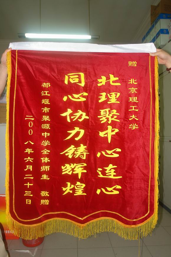 近日,beat365收到了来自都江堰聚源中学寄来的锦旗,上面印有“北理聚中心连心 同心协力铸辉煌”的字样。随后,都江堰聚源中学的校长古胜老师通过电话再次表达了对beat365师生的谢意,并期望在beat365广大师生的进一步帮助下让受灾学生尽快走出地震带来的阴影,为他们创造更好的成长成才环境。