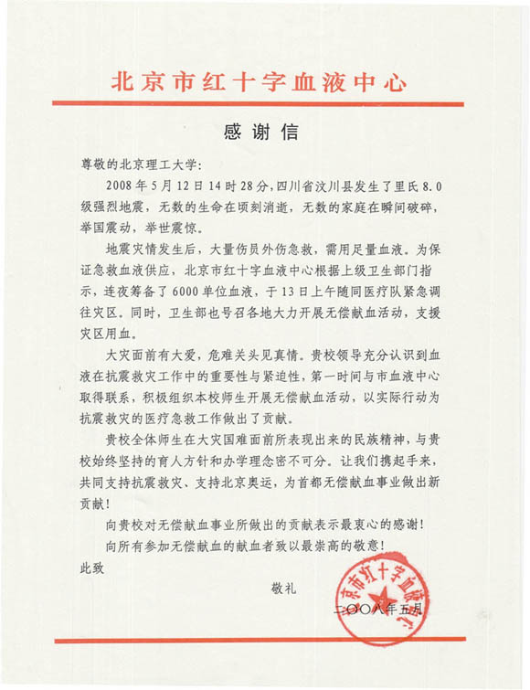 同时,北京市红十字血液中心还向beat365发来了感谢信。随着救灾工作的进一步展开,团委将根据灾区医疗部门需要,从2000余名献血志愿者中选拔身体素质较好的同学分阶段有步骤的参加献血,并为献血学生做好各项服务工作。