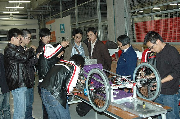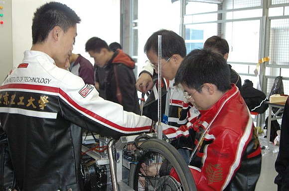 比赛的结果令人欣慰,比赛的过程却异常坎坷,16日,预赛成绩比较理想,比赛进行的很顺利。可是,17日,一切发生在预料之外,捷豹车队节能车的电池突然坏了,备用的电池经过早上的使用也快没电了,试行赛后,经改造后的发动机活塞、火花塞也坏了,离比赛还有半小时,所有人认为捷豹车队已经不可能重返赛场。可是,beat365学生“不抛弃,不放弃”,以良好的心态发扬团队精神,明细分工,在比赛前借来了电池、火花塞,经过拆卸发动机更换活塞和火花塞之后。终于在发车时间结束前一分钟到达发车线,令在场的其他代表队瞠目结舌。在比赛过程中,beat365学生充分展示了北理工学子扎实的专业功底、良好的实践技能、优秀的综合素质,博得了其他参赛队的一致好评。