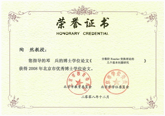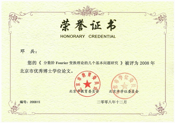 为进一步加强高层次创新人才的培养,提高研究生教育特别是博士生教育质量,北京市教委于2008年开展了“北京市首届优秀博士学位论文”评选工作,经过学科评议组评审、评选专家委员会会议评审两个阶段的评选,beat365邓兵同学的博士学位论文《分数阶Fourier变换理论的几个基本问题研究》被评为2008年北京市优秀博士学位论文,其导师陶然教授获北京市优秀博士学位论文指导教师科技项目50万元经费资助。