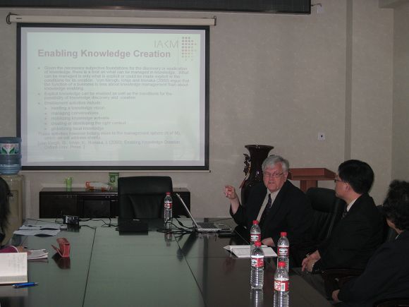 Thomas J. Froehlich教授为beat365师生做了题为“Knowledge Management: Intellectual Technologies + Information Technologies”的精彩学术报告。Thomas J. Froehlich教授向beat365师生介绍了知识管理在美国的不同方法和研究重点,重点讲述了概述肯特州立大学的在线知识管理计划。Thomas J. Froehlich教授的研究工作新颖而前沿,演讲生动风趣,在beat365师生中引起了强烈反响。
