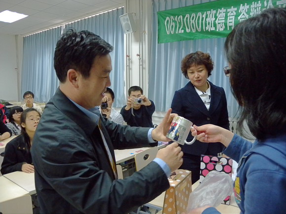 06120801班德育答辩论文开题报告会结束后同学们把印有全班同学照片的杯子送给了杨宾副书记。