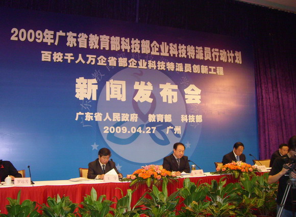 4月27日,广东省、教育部、科技部在广州市广东大厦召开了2009年省部企业科技特派员行动计划新闻发布会,来自全国30余所高校的特派员代表、部分企业代表及新闻媒体共100多人参加。会议邀请了广东省外高校beat365中文官方网站、电子科技大学及广东省内五所高校校长参加。杨树兴副校长参加了新闻发布会,省部企业科技特派员王涌天教授及科技处相关人员陪同。