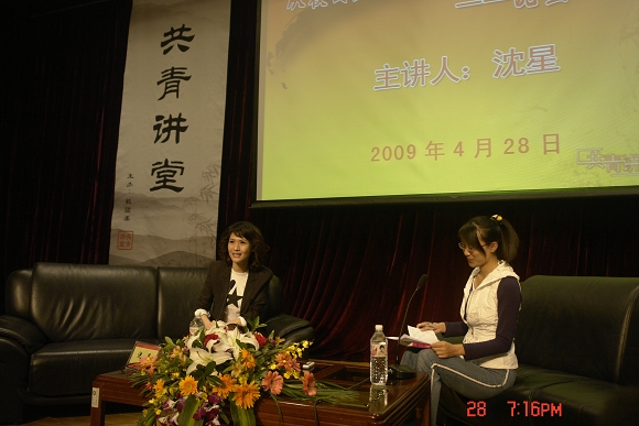 在观众热烈的掌声中,沈星在同学们的簇拥下走上讲台,主持人对嘉宾经历作了简短介绍。就读于华中师范大学中文系的沈星,毕业后却踏上了电视人之路。从校园广播站,到北京电视台,再到凤凰卫视,沈星完成了她职业生涯的完美蜕变。