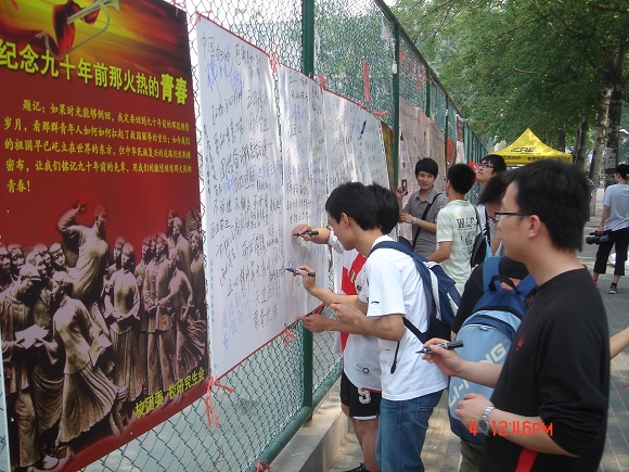 上午11:30,校研工委、校研究生会在新食堂对面同时举办了“五四运动九十周年青年感言‘纪念墙’”和“佩戴团徽,纪念九十年前那火热的青春”活动。校研究生会的学生干部热情邀请全校的青年师生在“五四运动九十周年青年感言‘纪念墙’”上书写自己的五四感言,并将一份份《弘扬五四精神 贡献青春力量》倡议书和一枚枚闪亮的团徽赠送给每一个参加活动的同学,希望大家通过佩戴团徽来纪念五四先辈的伟大精神,继承他们矢志不移追求的崇高理想。不到一个小时,“纪念墙”上便留下了同学们密密麻麻的感言。