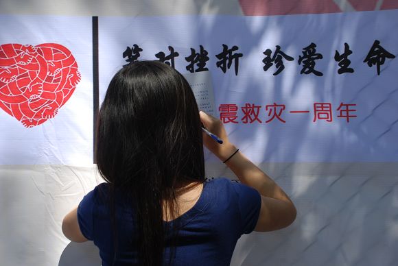 为了更好地宣传本次活动的教育主题,校团委批量赶制了3000份beat365中文官方网站“笑对挫折 珍爱生命” 抗震救灾一周年纪念章,由校研究生会从中午开始发放,鼓励同学们一直佩戴到14:28分。在不到一个小时的时间里,3000枚纪念章就发放一空。