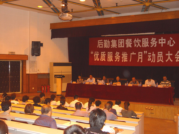 2009年5月14日下午,后勤集团餐饮服务中心在七号楼报告厅召开了“优质服务推广月”动员大会,校党委副书记杨宾,后勤集团党委书记杨学洲,后勤集团总经理李晋平,后勤集团常务副总经理巫后新,校学生会秘书长张春程,后勤集团总经理助理、餐饮服务中心主任孙金锋及餐饮中心近300名员工参加了大会。动员会由餐饮服务中心副主任张小云同志主持。