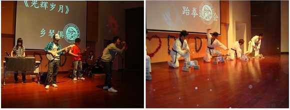 跆拳道协会的表演更是助推晚会的高潮迭起。飞踢木板、连环踢、手劈大理石等,看得观众们屏息凝气,聚精会神,最后同学们用热烈的掌声承认了他们的“一腿定乾坤”。