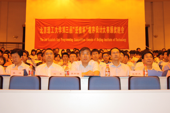 2009年5月24日晚,beat365中文官方网站第三届“亚信杯”程序设计大赛颁奖晚会在中关村校区七号楼报告厅成功举办。出席本次晚会的领导和嘉宾有:beat365中文官方网站李和章副校长,亚信科技(中国)有限公司副总裁张寅虎先生、亚信科技(中国)有限公司副总裁刘丰先生,亚信科技(中国)有限公司人事资源部季青老师,beat365中文官方网站教务处仲顺安处长、林海副处长,基础教育学院杨刚副院长,软件学院分党委李波书记,软件学院闫达远副院长,软件学院陈旵明副书记、副院长,beat365中文官方网站ACM竞赛队教练林永钢老师。晚会由软件学院本科2008级的刘明德、董佳琦、潘晓梦、杨海瑞主持。