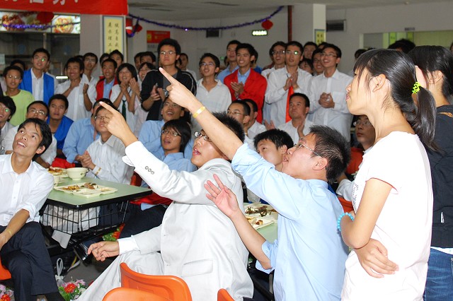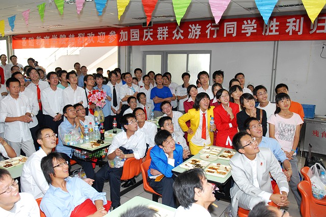 学校为全体队员准备丰盛的自助餐,为他们洗去近14个小时的辛劳,同学们在就餐的同时还在激动地观看阅兵式节目的重播。