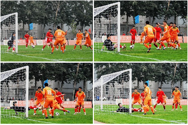 第75分钟,北京理工贵人鸟足球队组织反击,18号杨思源带球到底线,宏登队的犯规让北京理工贵人鸟足球队获得了又一次的前场任意球的机会。8号袁微将球传到弧顶处附近,24号杨阳的头球攻门被于一航挡出,此时北京理工贵人鸟足球队门前有三个队员埋伏在宏登队门前,38号埃米尔机警的将球打入对方球门将比分改写成1:0。之后宏登队开始了疯狂的进攻,但是并没有很好的射门机会。