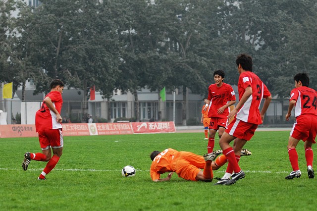 在顶住大学生前15分钟进攻之后,宏登队开始组织反击,双方开始了精彩的对攻大战。先是宏登队在第17分钟由14号刘刚带球突破,几次精彩的晃动并没有突破北京理工贵人鸟足球队的三人防守,丢球后的刘刚在反抢中犯规也领到了本场比赛双方的第一张黄牌。1分钟后,北京理工贵人鸟足球队4号卢斌也在防守对方反击时犯规同样领到黄牌。第25分钟,宏登队14号刘刚在前场得到队友的抢断球后在禁区外起脚远射,球打在球门右侧立柱后弹出底线,宏登队也错失了本场比赛最好的机会。