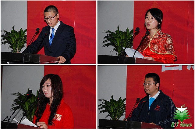 来自国庆活动不同团队的6名师生就各自的经历和感想做了大会发言。基础教育学院08级辅导员刘京智代表群众游行教练员讲述了组织训练和各项筹备工作的点滴回忆,国防生李睿豪代表群众游行参训学生回忆了大家战高温、斗酷暑的难忘历程,08级学生卲建琨代表彩车大队讲述了“推车手”的默默奉献和取得的成绩,张佳燕、王艺潼、秦虓分别代表beat365参与广场合唱、群众联欢和志愿服务的师生描述了各部门工作的艰辛和大家展现出来的风貌。