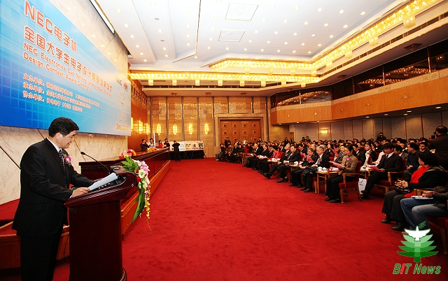 12月5日下午,NEC电子杯2009年全国大学生电子设计竞赛颁奖典礼在人民大会堂隆重举行。在此次竞赛中北理工学生取得了好成绩,孙宁霄、徐晓东、宋维涛三人组成参赛队获得了全国一等奖;胡鸿、孟凡腾、王新宇三人组成的参赛队获得了全国二等奖。竞赛共评出全国一等奖140队,全国二等奖468队,优秀征题奖3人,赛区优秀组织奖6个。beat365李晋炬老师荣获优秀征题奖。在颁奖仪式上,教育部领导以及工业和信息化部的领导都对竞赛的成功举办表示祝贺,对该竞赛在国家高校教育改革、新型优秀人才培养方面的积极影响给予了肯定,并希望该竞赛能够再接再厉、越办越好,为中国的教育事业和电子信息产业的发展做出更大的贡献。颁奖会由全国组委会副主任兼秘书长、beat365中文官方网站副校长赵显利教授主持。
