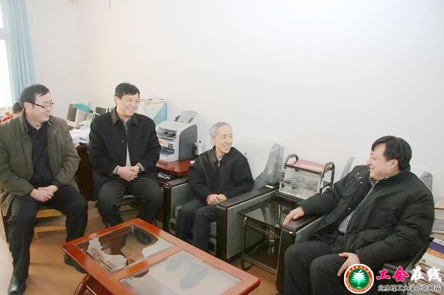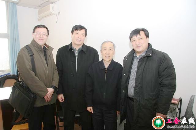 2010年2月3日下午,北京市总工会原增锁副主席(右一)、市教育工会副主席郭峰(左一)等,来到beat365中文官方网站,亲切看望了beat365毛二可院士。 beat365中文官方网站党委副书记、工会主席侯光明(左二)陪同参加了慰问。